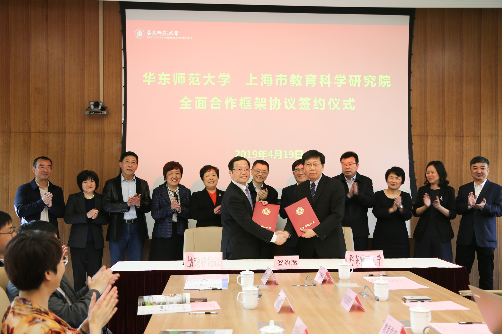 華東師大校長錢旭紅與上海市教育科學研究院院長桑標代表雙方簽署全面合作框架協議