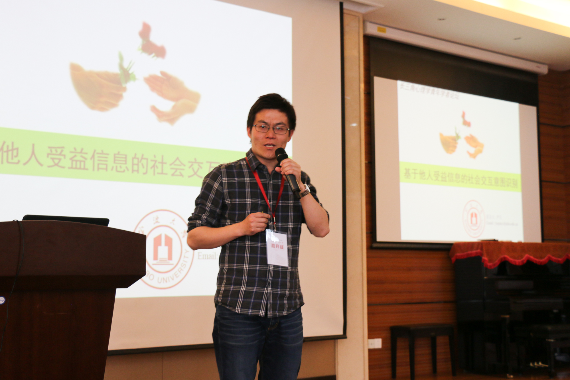 19日下午的專題報(bào)告(一)為“社會(huì)心理與健康”專場(chǎng)。南京師范大學(xué)副教授徐慰、寧波大學(xué)副教授尹軍、華東師范大學(xué)副教授宋永寧、上海交通大學(xué)胡楊老師、華東師范大學(xué)教授段錦云進(jìn)行了學(xué)術(shù)報(bào)告,主題涉及基于動(dòng)態(tài)評(píng)估的正念測(cè)量與研究、基于他人受益信息的社會(huì)交互意圖識(shí)別、自閉譜系障礙兒童的表情模仿、精神障礙中頂葉記憶網(wǎng)絡(luò)的研究,以及心理距離對(duì)創(chuàng)業(yè)機(jī)會(huì)識(shí)別的影響。