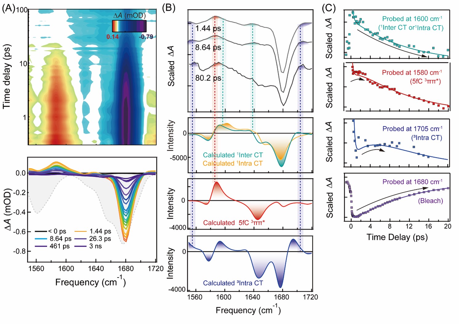 圖2. (A)285 nm激發d(G5fC)9?d(G5fC)9雙鏈的時間分辨中紅外光譜。(B)具有代表性時間延遲下的實驗光譜與理論計算相關激發態光譜對比圖。(C)特征波數處的動力學曲線。