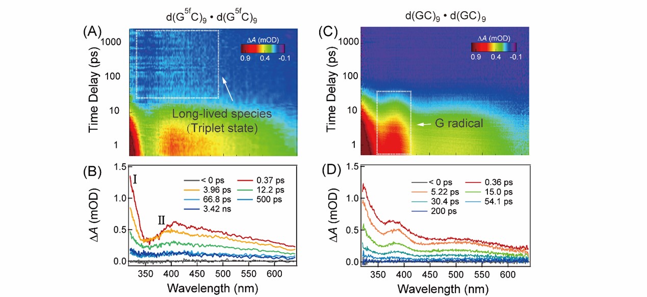 在本項研究中,建立由鳥嘌呤和5-醛基胞嘧啶組成的模型DNA雙鏈結構。圖1(A-B)展示了285nm激發d(G5fC)9?d(G5fC)9雙鏈的飛秒時間分辨的瞬態吸收光譜數據。結果顯示,紫外光激發態激發d(G5fC)9?d(G5fC)9雙鏈后,會在小于20ps的時間內產生三重態,三重態量子產率為8 ± 3%。這與未進行表觀遺傳修飾DNA的超快激發態弛豫過程形成鮮明的對比(圖1C-D)。
