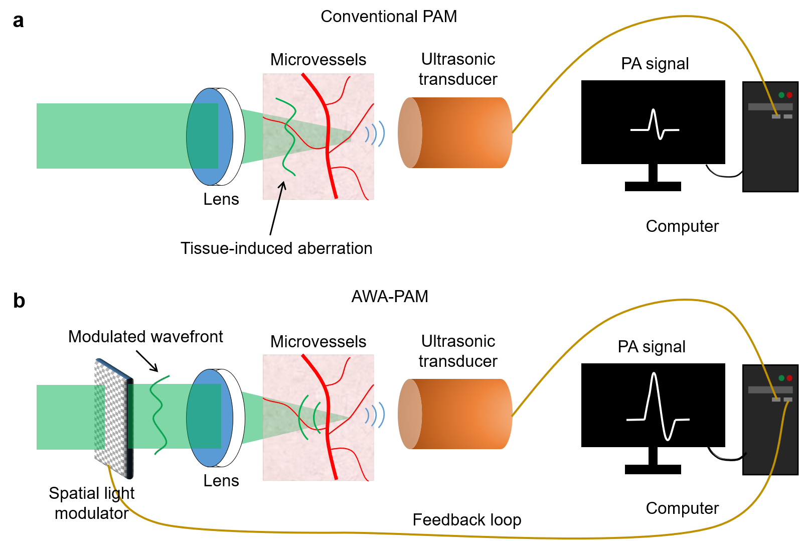 光聲顯微成像是一項利用非電離光子和低散射超聲進行成像的關鍵技術,在眾多科學和工程領域具有重要的應用意義。然而,由于生物組織折射率的不均勻性,光波在傳播過程中會發生畸變,導致光學像差的形成,從而引起焦點強度的降低和尺寸的增大。因此,在光聲顯微成像中,光學像差的存在不可避免地導致成像信噪比和分辨率隨成像深度增加而降低。然而,由于光聲成像具有獨特的超聲檢測模式,傳統用于修正像差的自適應光學技術在適應主流光聲成像系統方面存在著不適配的問題。