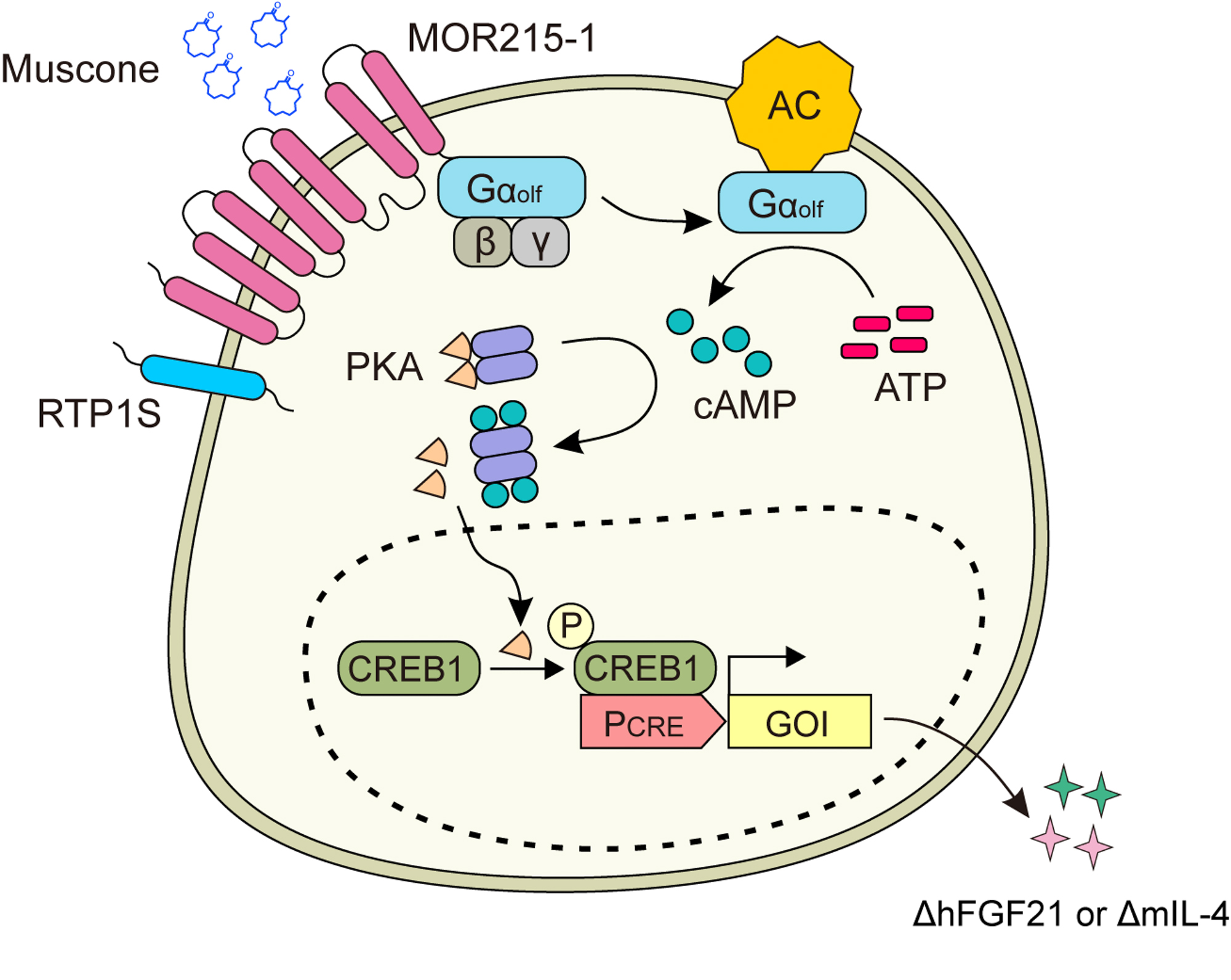 芳香療法在日常生活中常用于心理疾病治療,通過吸入芳香精油,能夠緩解壓力,舒緩心情,研究者試想能否將該“聞香療法”應(yīng)用于慢性疾病中?麝香酮是中藥材麝香的主要活性成分,是一種具有揮發(fā)性和香氣的臨床藥物,已被國家批準(zhǔn)用于食品、藥品、以及香水中。鑒于麝香酮的安全性、揮發(fā)性,研究人員基于感應(yīng)麝香酮的小鼠嗅覺受體MOR215-1和合成的cAMP響應(yīng)的啟動子(PCRE),在體外成功構(gòu)建了低背景、高誘導(dǎo)的麝香酮調(diào)控的基因環(huán)路(muscone-regulated gene circuit, MUSE)。當(dāng)麝香酮與G蛋白偶聯(lián)受體MOR215-1結(jié)合后,激活胞內(nèi)的cAMP信號通路,隨后使得響應(yīng)cAMP的結(jié)合蛋白1(cyclic-AMP response binding protein, CREB1)磷酸化后結(jié)合到PCRE啟動子上,進(jìn)而啟動目的基因表達(dá)(圖1)。體外驗證結(jié)果顯示,麝香酮與細(xì)胞在沒有直接接觸的情況下,麝香酮自身的揮發(fā)性,可以實現(xiàn)遠(yuǎn)程調(diào)控基因的表達(dá)。