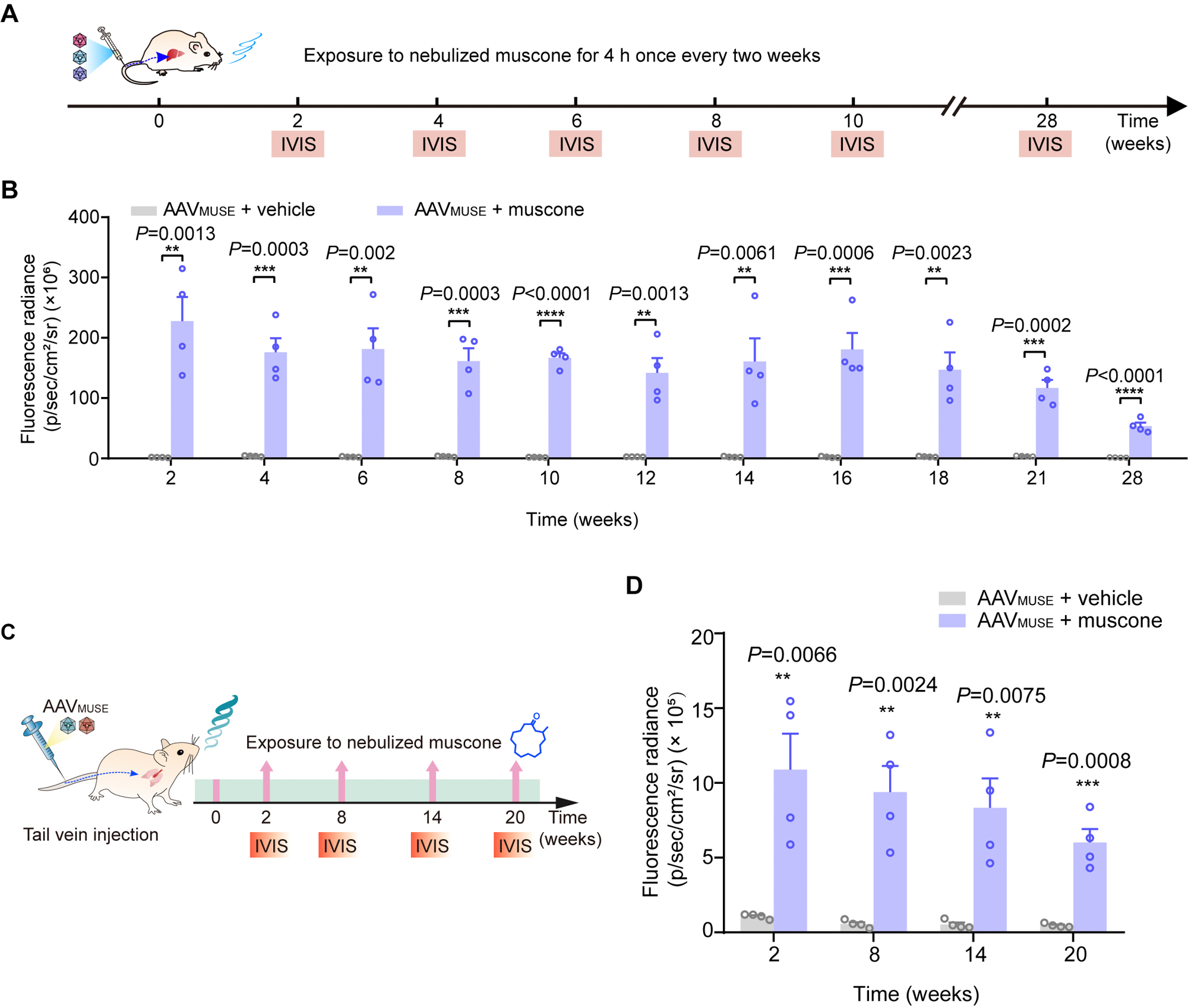 因此我們將麝香酮調(diào)控基因環(huán)路裝載在AAV病毒載體中,設(shè)計構(gòu)建了AAV介導(dǎo)的麝香酮調(diào)控的基因環(huán)路(AAVMUSE),利用AAV的多器官靶向性將該環(huán)路轉(zhuǎn)導(dǎo)至肝臟或肺部,通過定期“聞香”實現(xiàn)長期精準(zhǔn)控制蛋白藥物的表達(dá)釋放(圖2)。