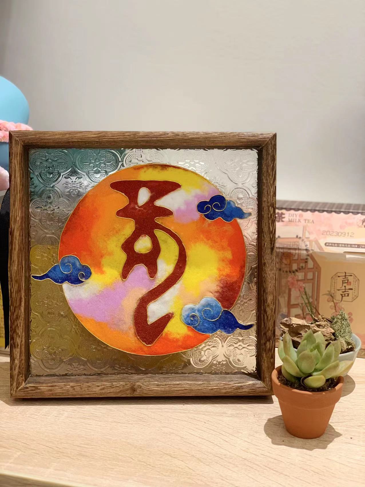 作品說明:以甲骨文中最具代表性的“龍”字樣式為主體靈感,用掐絲琺瑯手法結合祥云圖樣繪制而成,掐絲琺瑯工藝和甲骨文都是中國文化中璀璨的一支,將兩者相結合創作旨在用優秀的傳統文化喜迎龍年。
