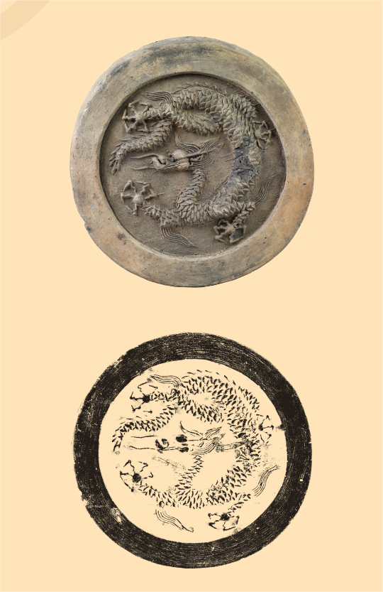 據華東師大博物館編《中國古代磚瓦》記載,瓦當當面龍紋中龍呈飛舞狀,腿部粗壯,五個龍爪剛勁有力,龍麟立體感十足。該瓦當延續了元代瓦當上龍紋龍首在瓦當正中的設計特點,龍身上紐后至頭頂的形態,至遲屬明代早期器,極有可能為洪武時期瓦當。