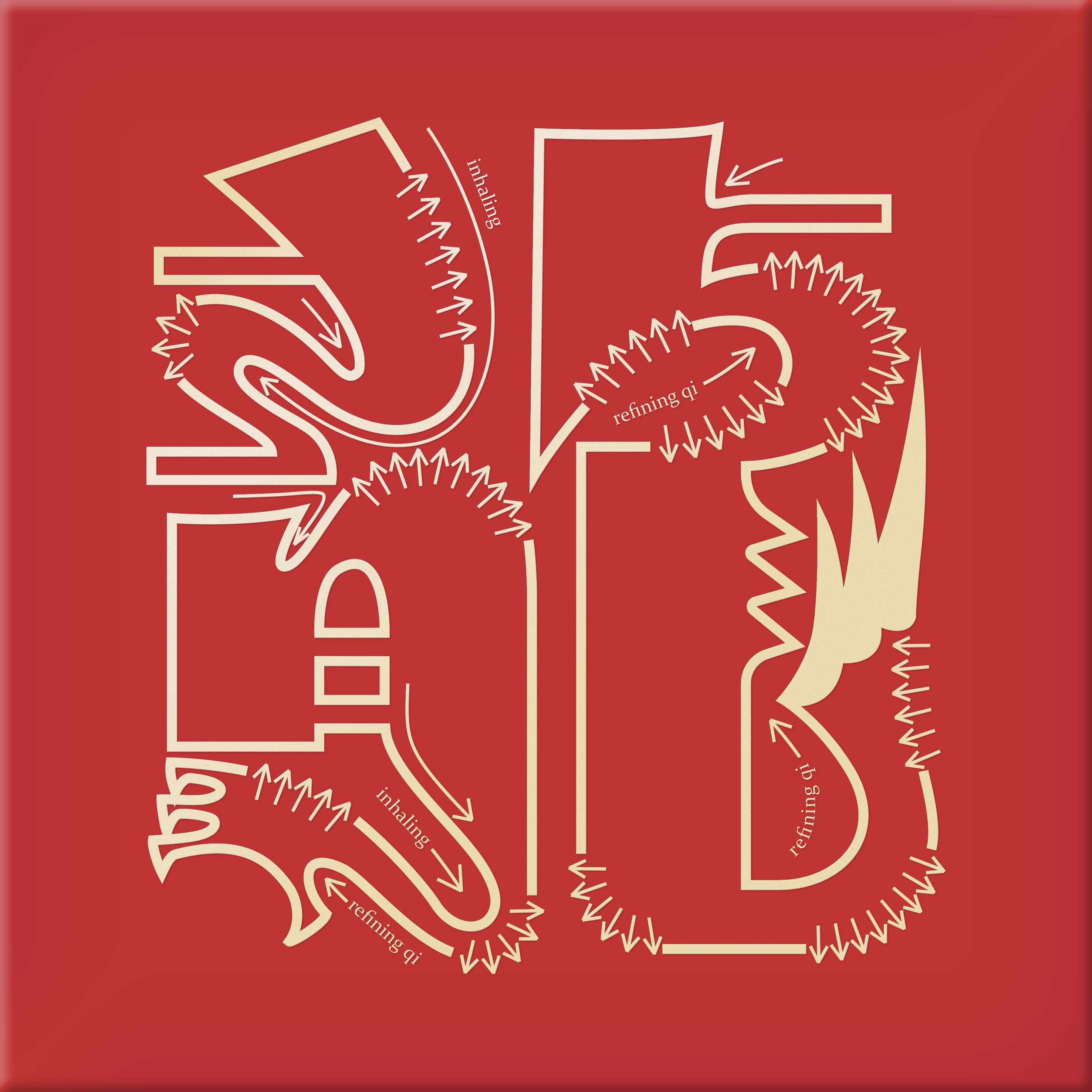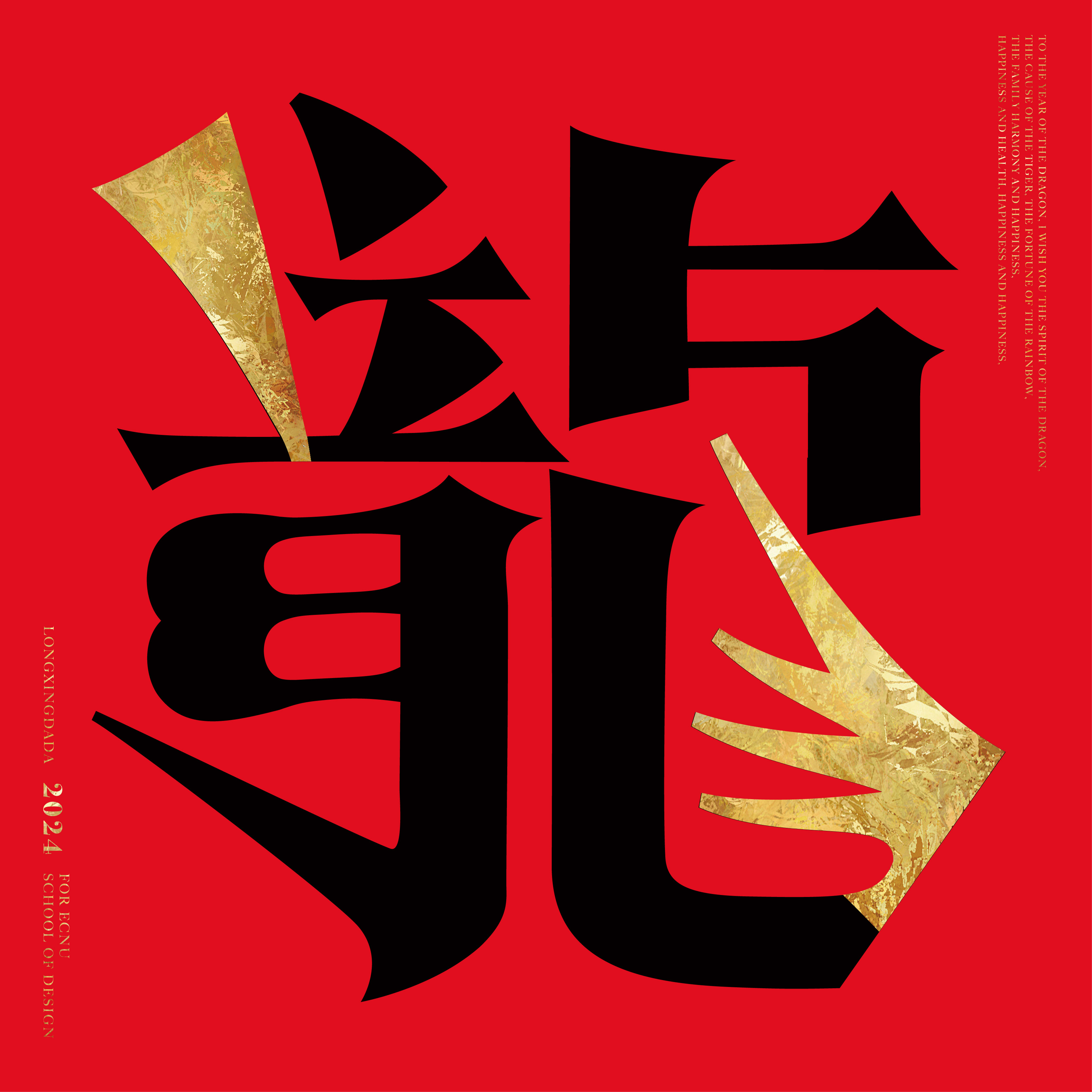 作品說明:以繁體字的龍為設計原型,將現代性的字形與傳統龍紋結合,形成極富沖擊力的視覺效果。右側金龍靈感來自于明朝戧金紅漆云龍紋,盤踞其中,昂首眺望,寓意“祥龍昂首,萬象啟新”。