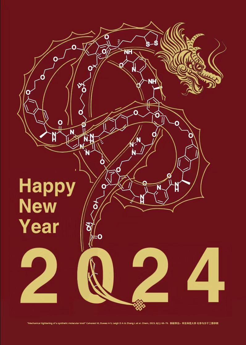 “這項研究成果的分子結形態酷似一條龍,我們便把它演變成工作室2024年的新年賀卡設計。”張亮介紹道:“作為中華民族的精神圖騰,龍是力量的象征。合成分子結結構相較于生物大分子結結構,不僅有著更緊密的結構,也擁有更好的力學性質。在傳統龍形結的啟發下,我們根據龍在空中盤旋纏繞的形象設計了分子龍形結,用以展示合成分子結纏繞結構和優異的力學行為。”