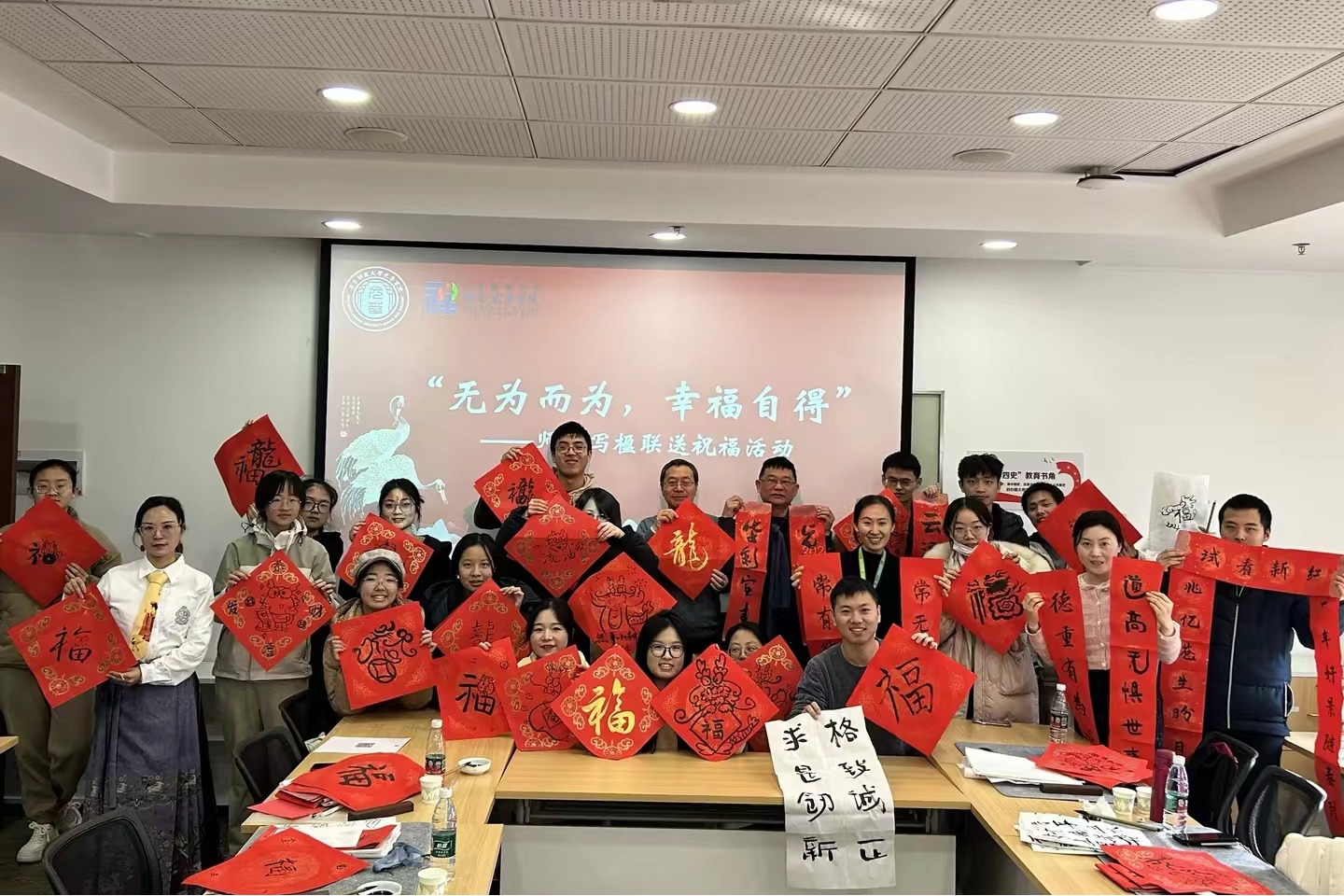 光華書院與社會發展學院在閔行校區聯合舉辦了“無為而為,幸福自得”師生寫楹聯送祝福活動。師生在學生社區共同書寫楹聯和創意龍字福,并分別展示和講解了各自作品創作過程及背后美好的寓意,共同體悟老子思想與民俗傳統,用筆墨書香傳遞對幸福生活的向往,共迎佳節。