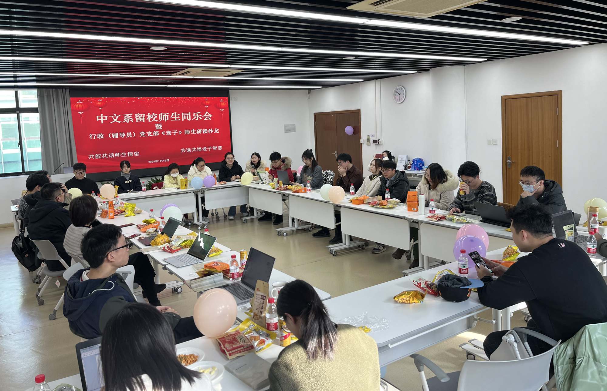 在中文系留校師生同樂會暨行政(輔導員)黨支部《老子今注今譯》師生研讀沙龍上,中文系部分教師與寒假留校的本、碩、博學生歡聚一堂。在場師生共同研讀陳鼓應先生所著的《老子今注今譯》。留校學生就畢業論文寫作、未來職業規劃、在校生活感悟等方面進行分享,在場老師對同學們的困惑提出建議,叮囑學生放平心態,利用假期調整生活節奏,多與同學和老師溝通交流。
