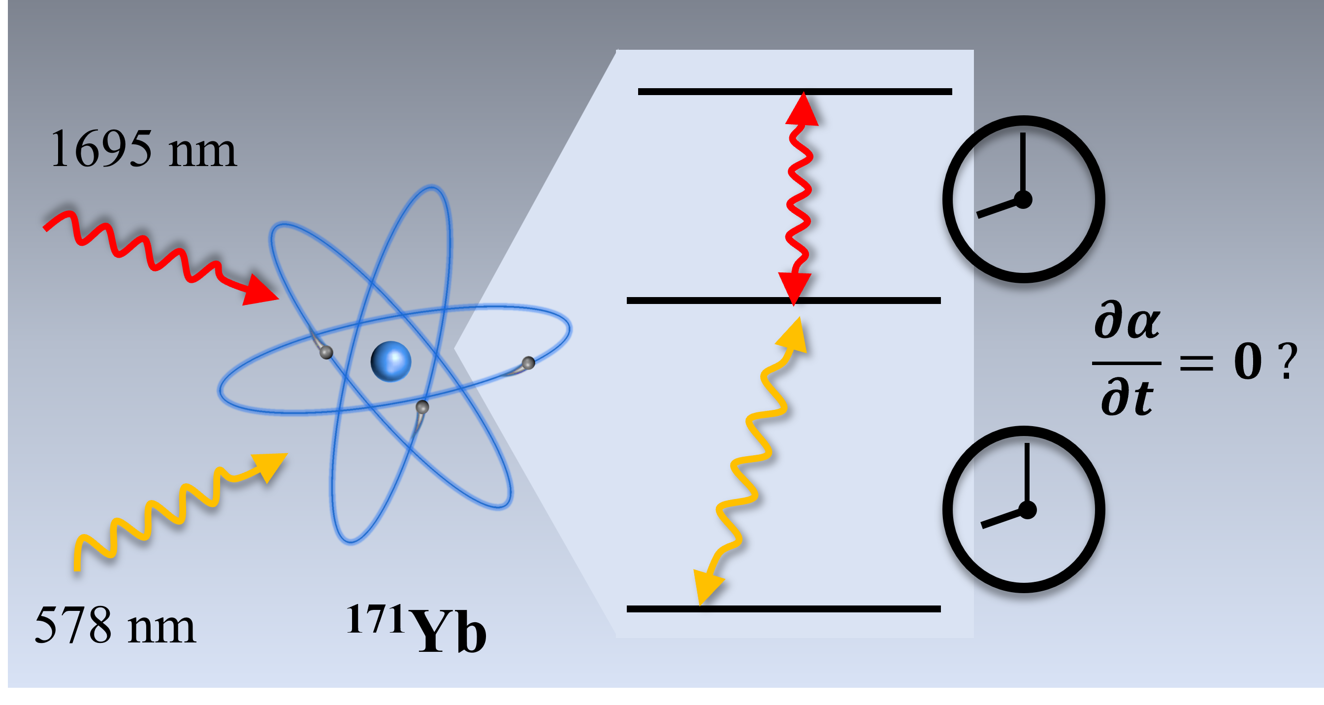 徐信業教授指出,這僅僅是研制內殼層鐿原子光鐘剛邁出的第一步,后續還有許多難關需去攻克。盡管目前研制的鐿原子光鐘還有許多不足之處,但他們充滿信心,還會繼續努力。由于內層電子受到外層電子的隔離,能減弱外場對其擾動,因此,內殼層原子光鐘有望在性能指標上超越目前基于外層電子的原子光鐘,從而為我國在即將到來的秒定義修改中爭得話語權而創造更有利條件。目前這項工作意義還在于將為當前我國開展前沿性基礎物理研究提供一種超高精度的測量手段,從而有助于增強我國在前沿性基礎物理研究領域的國際競爭力。比如與課題組前期已研究成熟的578nm鐘躍遷結合,構建成雙鐘頻鐿原子光鐘,如圖3所示,可以前所未有的測量精度探詢精細結構常數是否隨時間變化,這將為檢驗現有物理理論是否正確提供十分重要的依據。