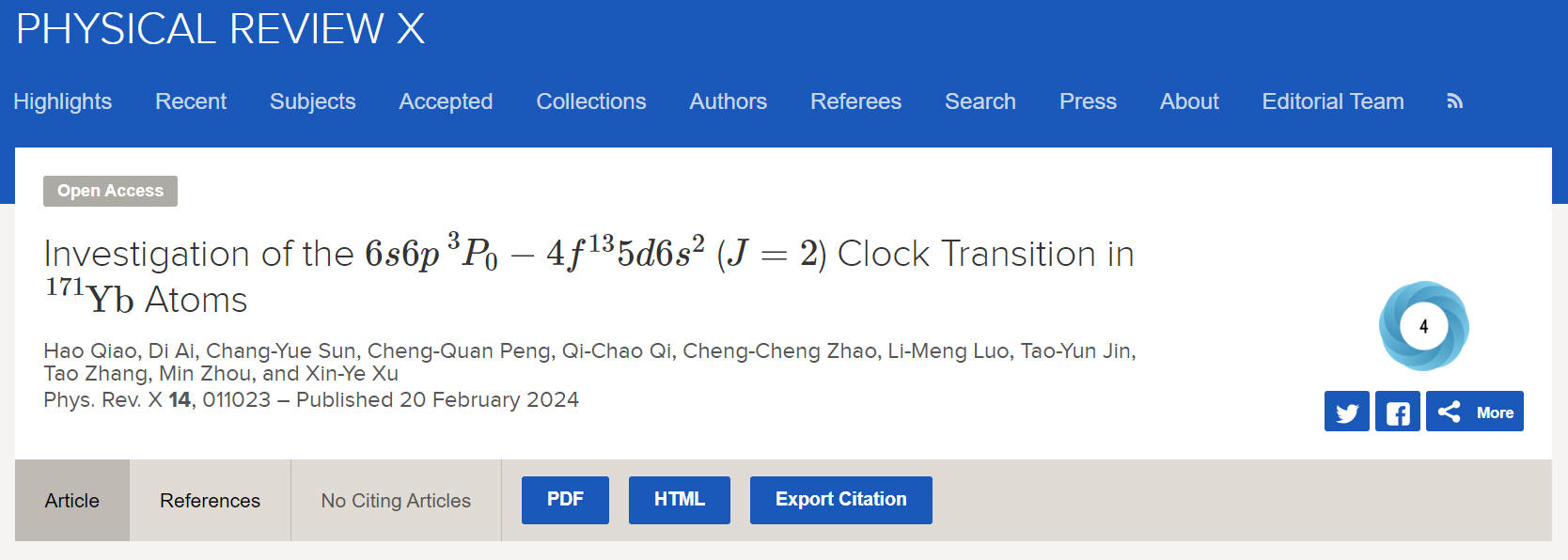 徐信業教授課題組該項研究成果Investigation of the 6s6p?3P0?4f135d6s2 (J=2) Clock Transition in 171Yb Atoms于2024年2月20日在線發表在國際著名學術期刊Physical Review X上。此項工作被審稿人認為是國際上首次對1695nm內殼層鐿原子光鐘開展了系統全面的實驗性研究。博士生譙皓和艾迪為共同第一作者,徐信業教授為唯一通訊作者,華東師范大學為第一完成單位。