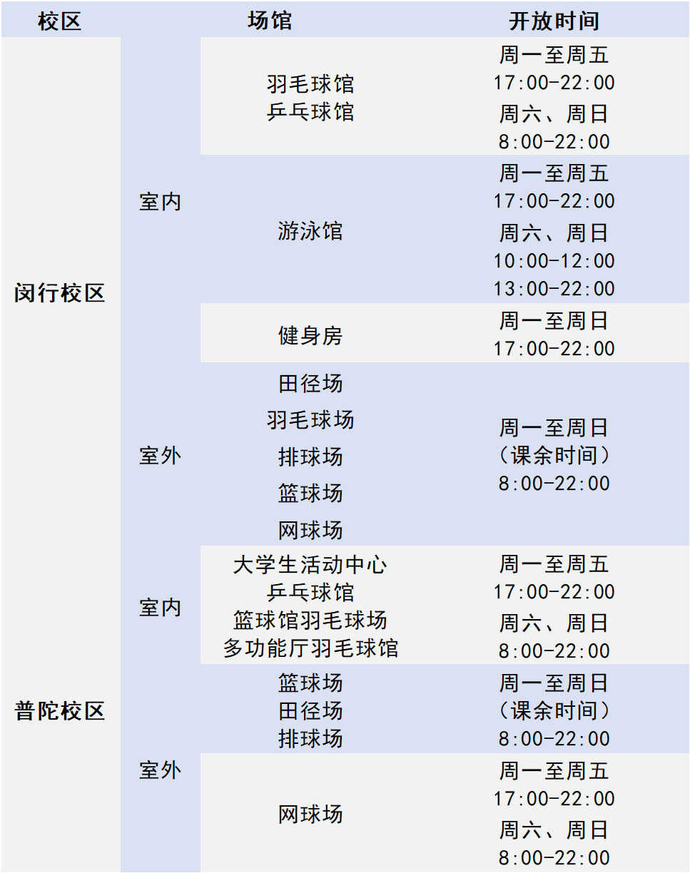 ·借用地點(diǎn):東田徑場北側(cè)器材室(閔行校區(qū))、共青場看臺下器材室(普陀校區(qū))