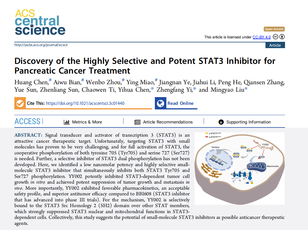 華東師范大學生命科學學院、上海市調控生物學重點實驗室劉明耀團隊與上海宇耀生物科技有限公司攜手開展產學研用創新合作,并于近日在美國化學會國際權威期刊 ACS Central Science 在線發表了題為 Discovery of the highly selective and potent STAT3 inhibitor for pancreatic cancer treatment 的研究論文。該研究發現一種新型STAT3選擇性小分子抑制劑(YY002),并證明其在包含胰腺癌在內多種腫瘤上具有顯著抗腫瘤效果。YY002區別于多數已發現的STAT3抑制劑,其可同時抑制STAT3雙功能磷酸化,并且活性及選擇性優異,有望成為治療多種腫瘤的潛在藥物。
