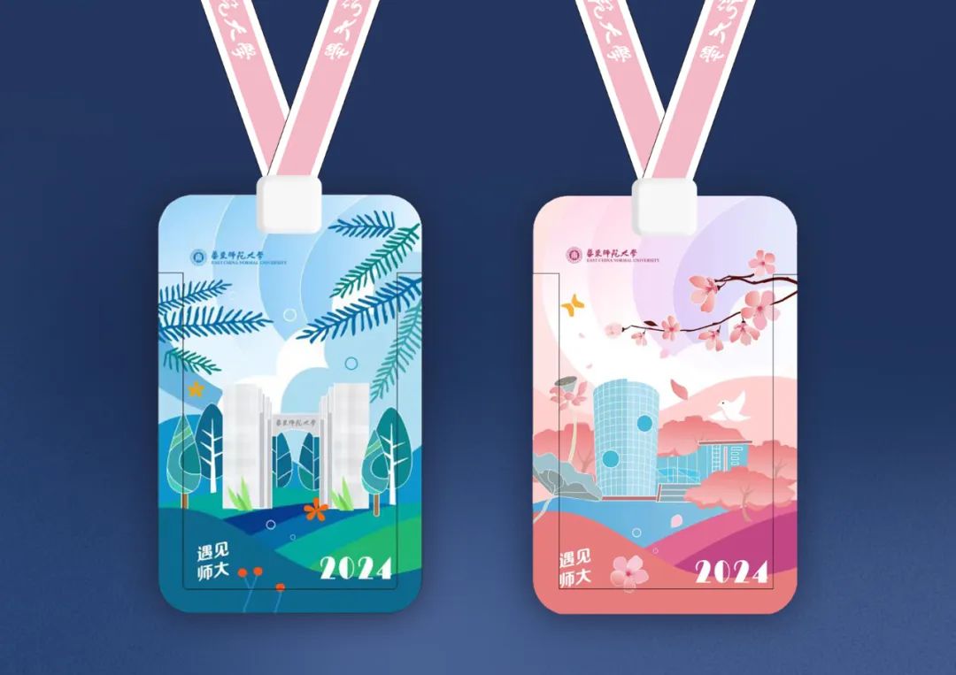 初見師大,將師大美景隨身攜帶吧!新生定制校園卡套分為兩款,隨機發送。藍色款融入了普陀校區的標識性建筑——中山北路校門和校樹水杉,紅色款則包含了閔行校區圖書館及校花荷花、櫻花林等元素。