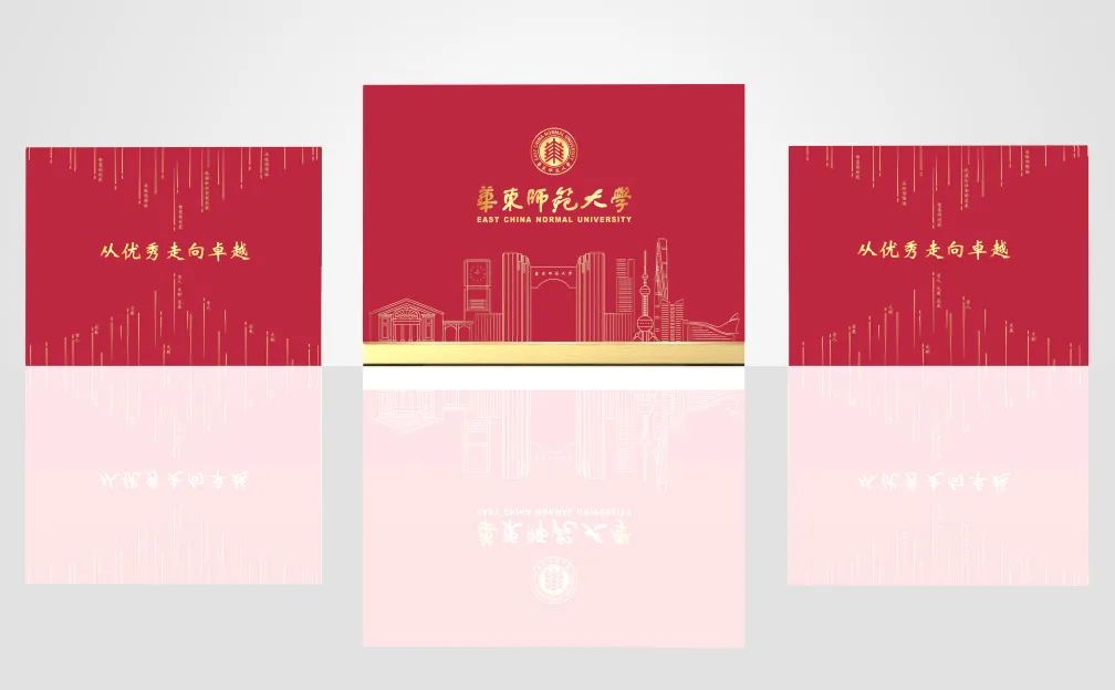 封套正面繪制了華東師大的LOGO和標志性建筑剪影,巧妙融入上海地標建筑元素,強調華東師大在上海的地域特色和深厚的歷史底蘊凸,顯華東師大的優雅學府風范。