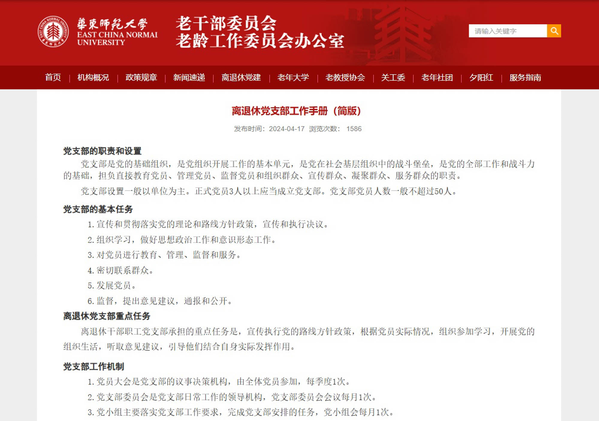 2024年,華東師范大學深入學習貫徹黨的二十大精神,按照中共中央辦公廳《關于加強新時代離退休干部黨的建設工作的意見》和上海市委辦公廳《關于加強新時代離退休干部黨的建設工作的實施意見》,聚焦學校離退休黨建工作,多措并舉,不斷提升離退休黨建工作質效。全校離退休黨員1518人,離退休黨支部63個,分布在全校31個院系級黨組織。