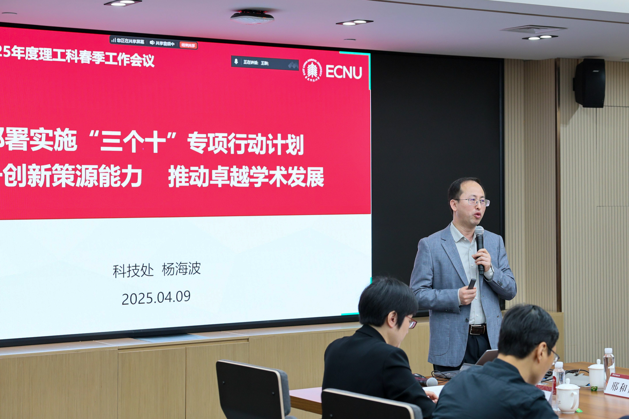 4月9日上午,華東師范大學2025年度春季學期理工科科技工作會議在閔行校區(qū)舉行。本次會議旨在深入貫徹習近平總書記關于教育、科技、人才一體化發(fā)展的重要指示,認真落實黨的二十屆三中全會精神、全國教育大會精神和教育強國建設綱要等重大部署,全面推進學校第十四次黨代會意見實施,發(fā)布并研討《華東師范大學理工科“三個十”專項行動計劃(2025-2027)》。會議以“部署實施‘三個十’專項行動計劃——提升創(chuàng)新策源能力 推動卓越學術發(fā)展”為主題,校長錢旭紅全程線上參加本次會議并作總結講話,副校長施國躍主持會議。校學術委員會及科學研究委員會代表、各職能部門及理工科實體科研單位負責人、科技處全體人員60余人參加本次會議。