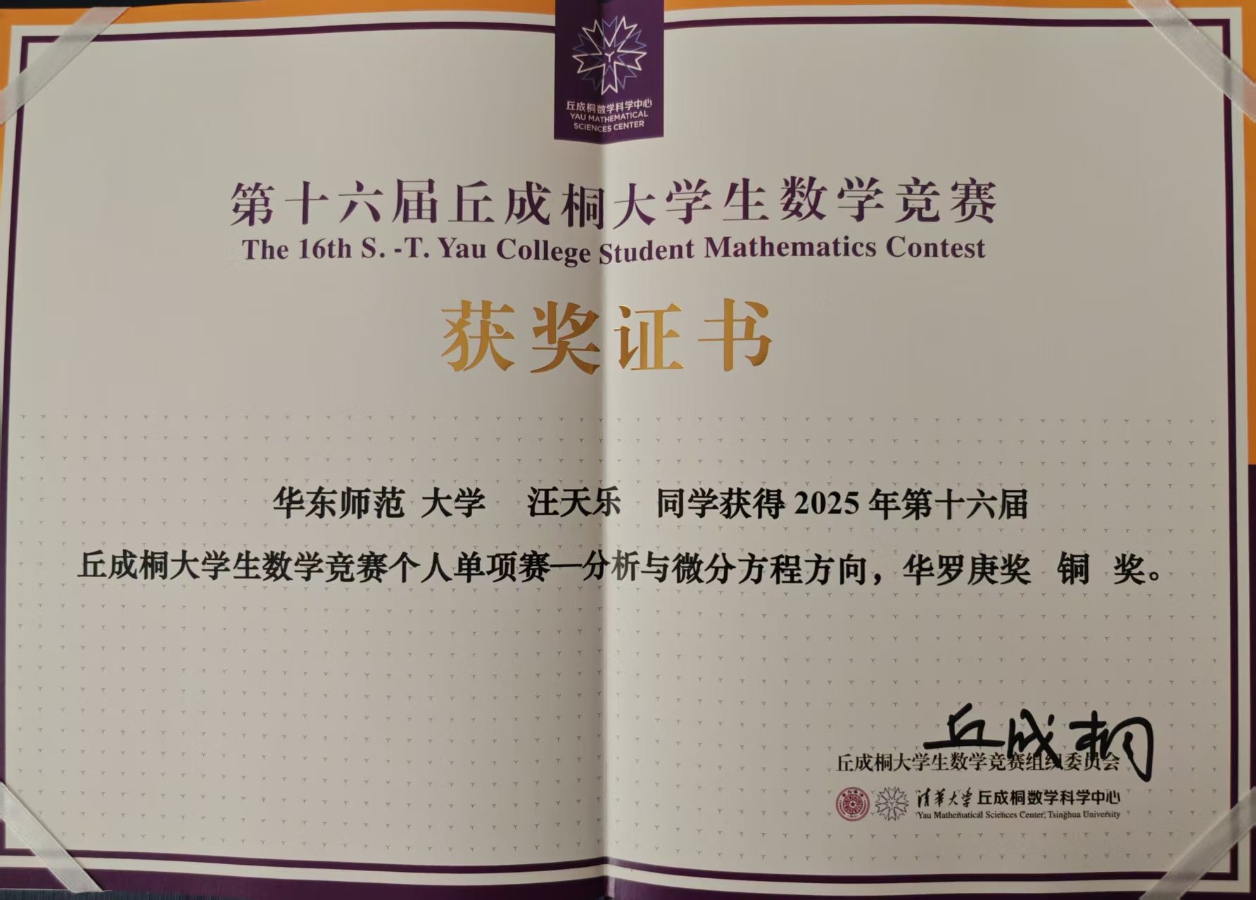 近日,第十六屆丘成桐大學生數學競賽舉辦。華東師大數學科學學院2021級本科生汪天樂憑借扎實功底和出色表現榮獲分析與偏微分方程方向個人單項銅獎,獲得我校在該賽事上的首枚獎牌。