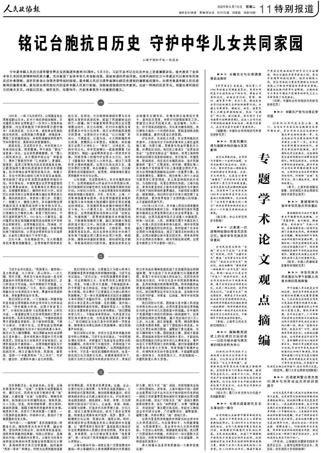 學習貫徹習近平總書記在紀念中國人民抗日戰爭暨世界反法西斯戰爭勝利80周年大會上的重要講話精神,深入研究全民族抗戰及臺胞抗日歷史,闡釋中國人民抗日戰爭勝利和臺灣光復的歷史意義,9月17日下午,“臺胞抗日史國際學術研討會——紀念中國人民抗日戰爭勝利暨臺灣光復80周年”在上海科學會堂舉行。