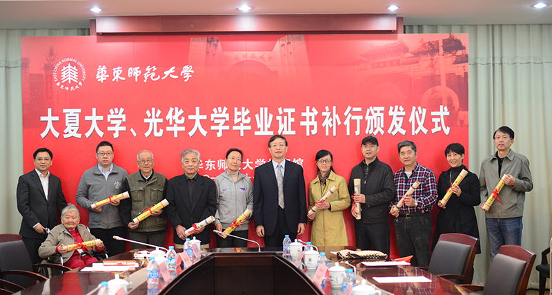 11月12日,大夏大學、光華大學畢業證書補行頒發儀式在中山北路校區舉行。1949屆蔣道福,1950屆的陳金華、胡和生等11位校友及家屬代表參加儀式,并現場領取了遲到60年甚至70年的畢業證書。副校長范軍出席儀式,儀式由檔案館館長湯濤主持。