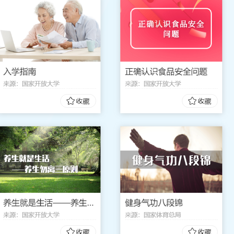其實,除了“云課堂”之外,在“國家老年大學”的網站上,還有大量無需注冊就能學習的各種各樣的免費課程,由全國各地開放大學、委辦局、科普機構等制作,比如上海開放大學的《二十四節氣與民俗文化》、科普中國的《氣候變化和地球生態》、國家體育總局的《健身氣功八段錦》……