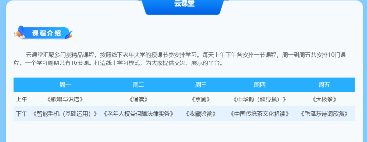 國家老年大學的“云課堂”究竟怎么學習?也許很多老年人還不太清楚。其實,只要打開“國家老年大學”的網站,點擊進入課程學習,只要年滿50周歲用手機注冊就能開啟免費的“云課堂”學習。從周一到周五,每天上下午各一門課程,有《歌唱與識譜》、《智能手機(基礎運用)》、《京劇》、《太極拳》……每一次學習后,老年人都可以獲得相應的積分。
