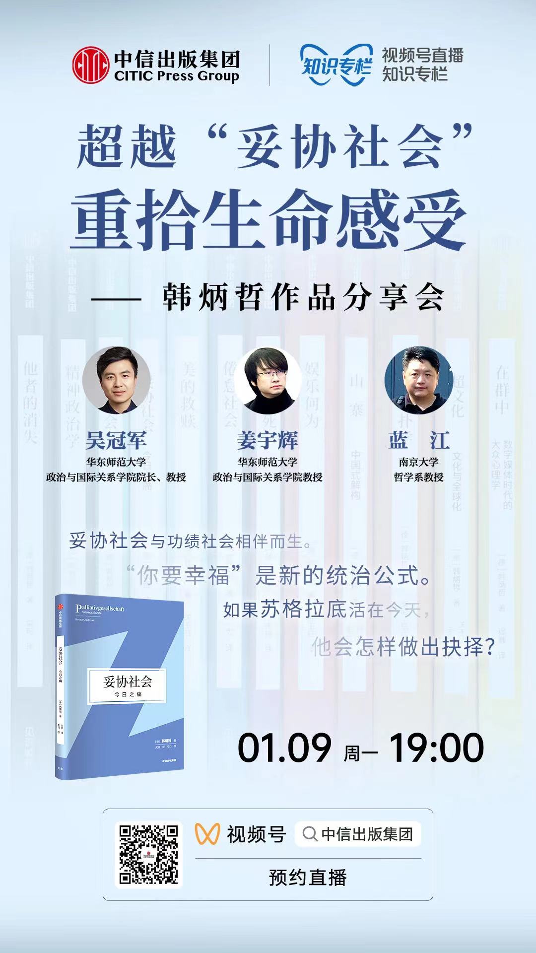 1月9日晚7點,圍繞德籍韓裔新生代思想家韓炳哲的《妥協社會》一書,聊聊后疫情時代,我們該如何面對肉體和精神上的疼痛,以及在元宇宙的虛擬世界里,我們會如何理解快樂與痛苦、幸福與創傷。