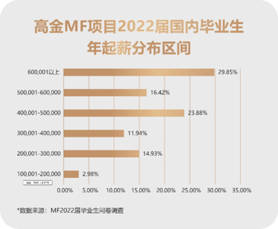 當然,薪資水平也是衡量就業質量標桿之一。對于上海高級金融學院金融碩士(MF)項目,2022屆國內畢業生平均年起薪56.2萬元,中位數達49.8萬元,雙雙創下歷史新高。其中更有七成畢業生的年起薪超過40萬元。而在面臨多份工作邀約情況下,約有18%的高金MF國內畢業生,放棄更高收入,選擇加入金融監管部門和政策性、戰略性金融機構等國家重點就業單位。同時,超過三分之二選擇在滬就業,服務于上海國際金融中心建設的國家戰略。