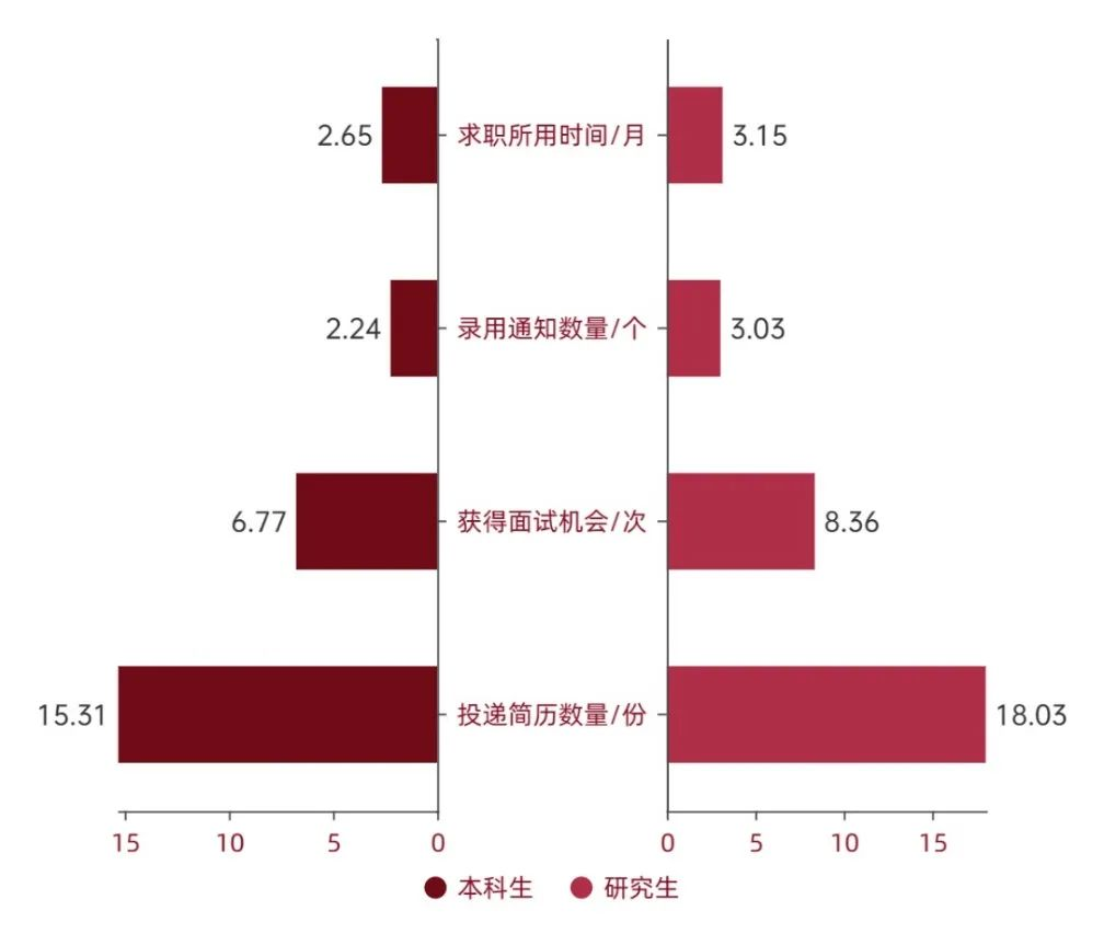 上海科技大學調查則表明,37.78%的就職畢業生在一個月內即完成了擇業,尤其有高達57.14%比例的本科生在一個月內完成了擇業,大多數就職畢業生的擇業過程未超過6個月,僅4.44%的就職畢業生擇業過程在6個月以上。總體上,平均每位就職畢業生在求職時發送了9.49份求職簡歷,求職期間獲得了3.89次面試機會,最終獲得了2.29份錄用通知書。