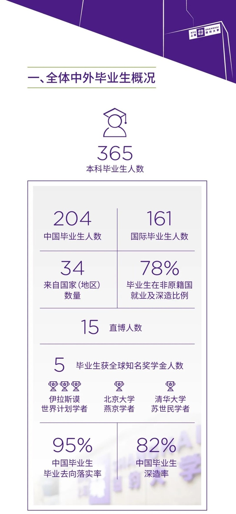 在中外合作舉辦的上海紐約大學,全體畢業生深造率也達62%。其中,15人在本科畢業后直接被全球頂尖博士研究生項目錄取,175人攻讀碩士研究生項目。尤其是中國畢業生,82%選擇繼續深造,人均獲得3.8份錄取通知書。