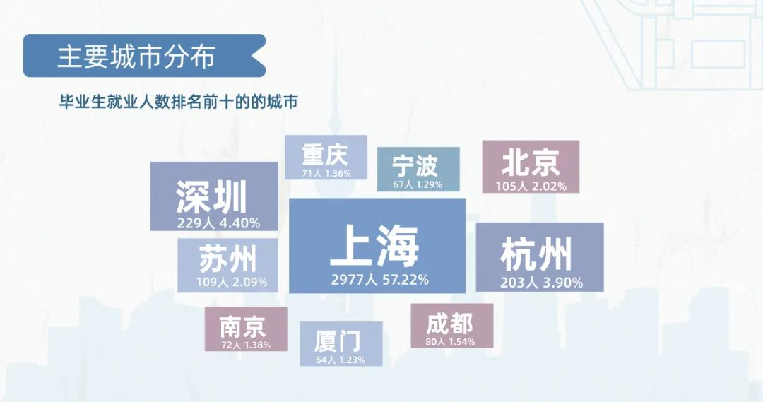 步入職場的上紐大中國畢業生就業領域主要集中在金融服務/會計/銀行、教育、管理咨詢、互聯網/軟件/信息技術/硬件、能源/水務等行業,其中比例最高的也是金融行業,占39%;其次為管理咨詢業和教育科研業,均占17%。而按就業單位地域劃分,78%的上紐大中國畢業生留在了上海工作,其次為北京、杭州、香港、成都,各占5.5%。