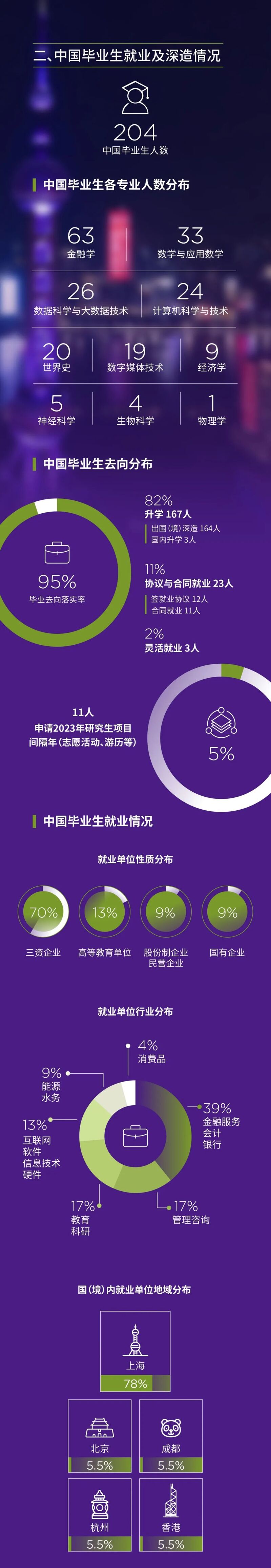 這些深造的上紐大中國畢業生中,103人前往USNEWS世界大學排名前50名的大學求學,占中國畢業生深造總人數的62%。其深造去向包括:哈佛大學、麻省理工學院、加州大學伯克利分校、牛津大學、哥倫比亞大學、華盛頓大學、劍橋大學等世界知名學府。11人獲得獎學金實現直博,占深造總人數6.6%。
