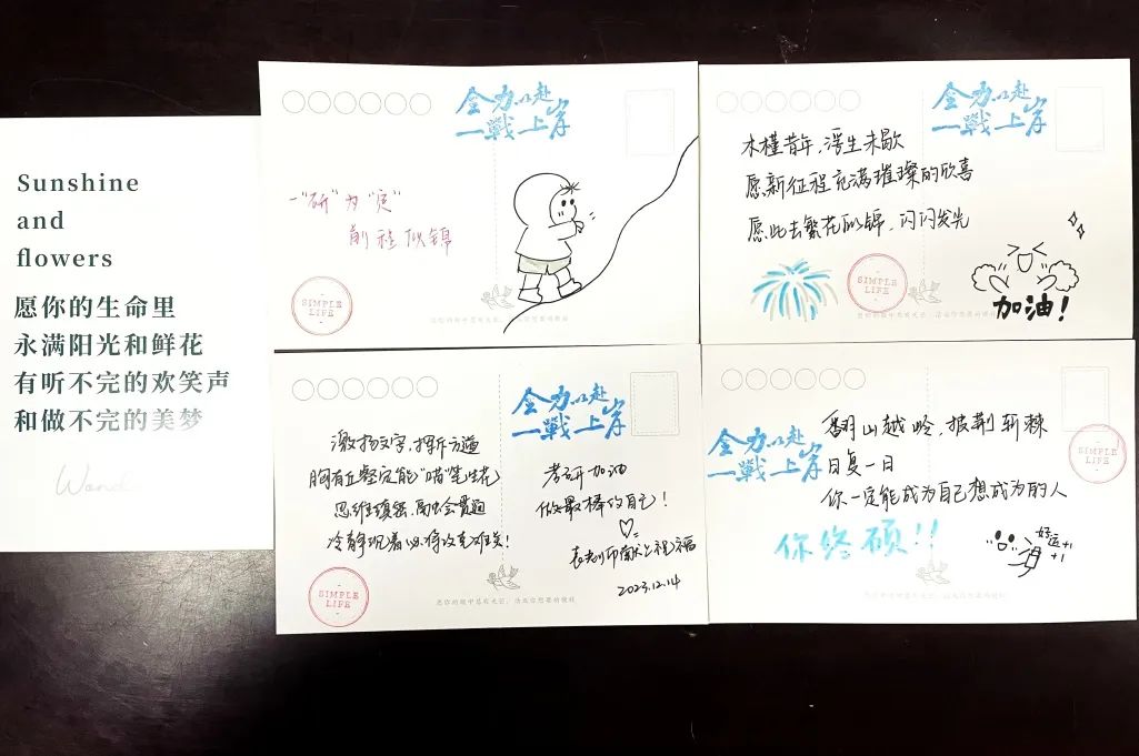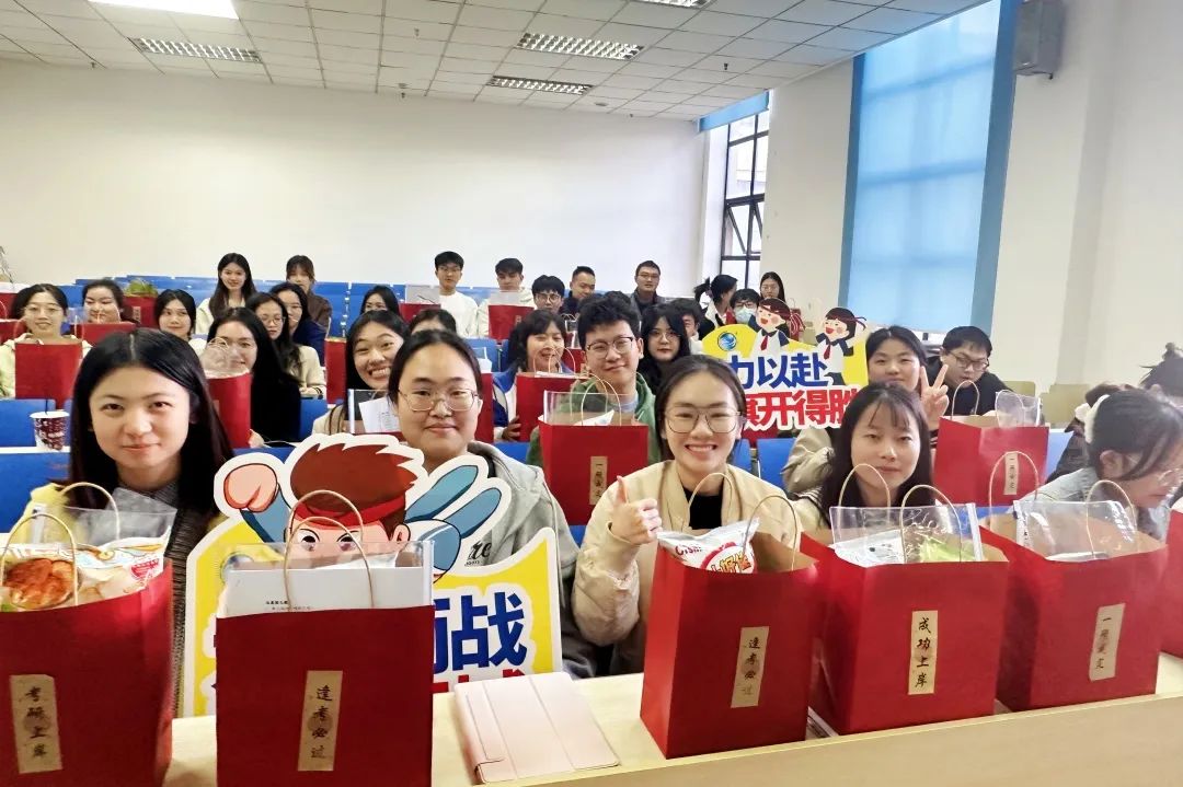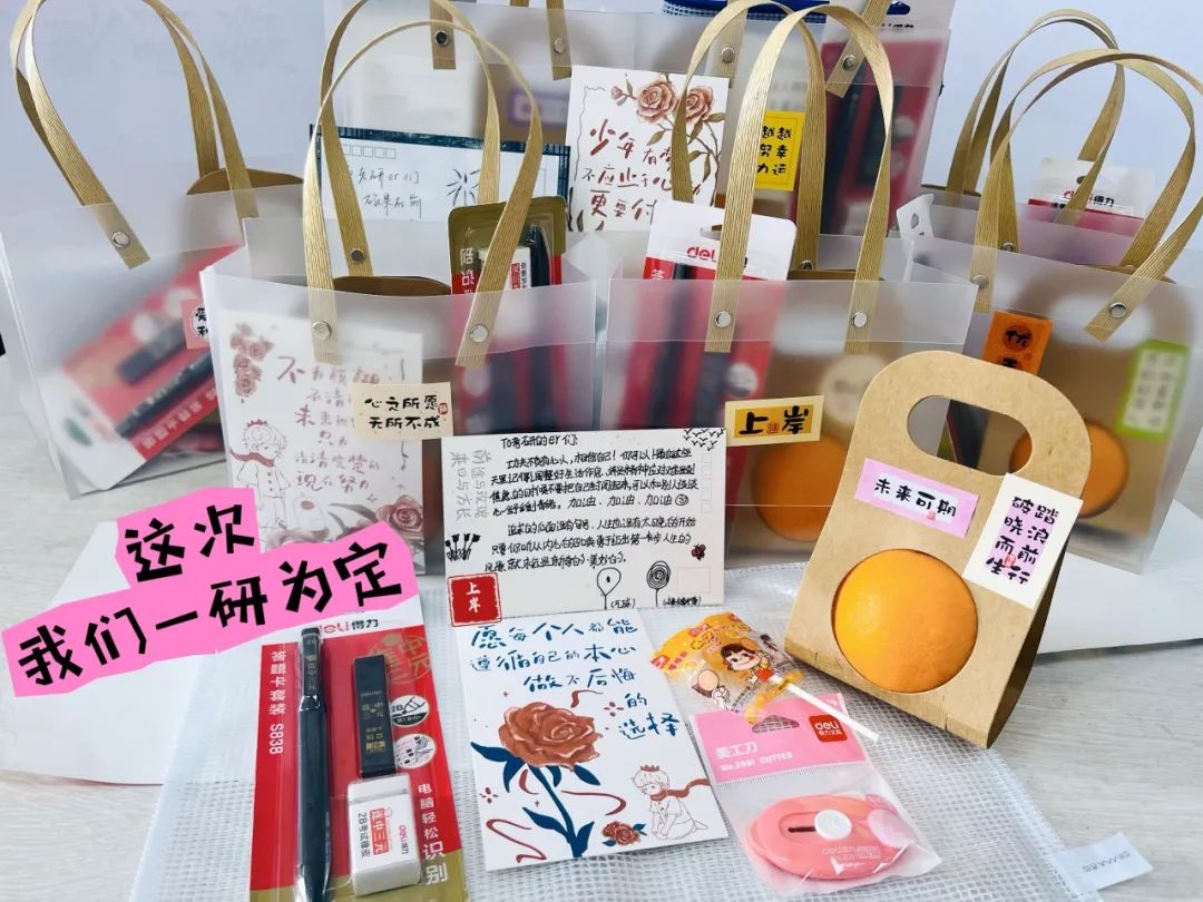 零食大禮包、手寫祝福卡、“助考文具包”……在上海應用技術大學,理學院的學弟學妹們通過視頻、卡片的形式獻上了美好祝福;考前,材料學院的老師們與學子面對面座談,緩解學生考前壓力;城建學院、人文學院為考研同學送上定制的愛心禮包。