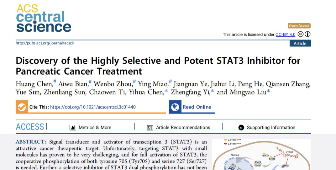 華東師范大學(xué)生命科學(xué)學(xué)院、上海市調(diào)控生物學(xué)重點(diǎn)實(shí)驗(yàn)室劉明耀團(tuán)隊(duì)與上海宇耀生物科技有限公司攜手開展產(chǎn)學(xué)研用創(chuàng)新合作,并于近日在美國化學(xué)會(huì)國際權(quán)威期刊?ACS Central Science?在線發(fā)表了題為?Discovery of the highly selective and potent STAT3 inhibitor for pancreatic cancer treatment?的研究論文。該研究發(fā)現(xiàn)一種新型STAT3選擇性小分子抑制劑(YY002),并證明其在包含胰腺癌在內(nèi)多種腫瘤上具有顯著抗腫瘤效果。...